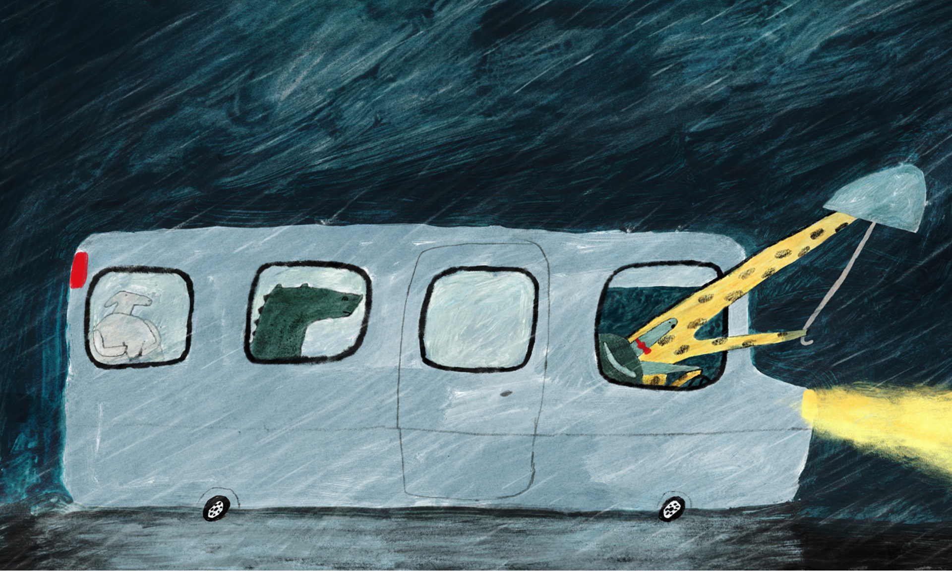 For the cover illustration I drew the bus and the four friends many times. Then I did a colour sketch using coloured pencils.